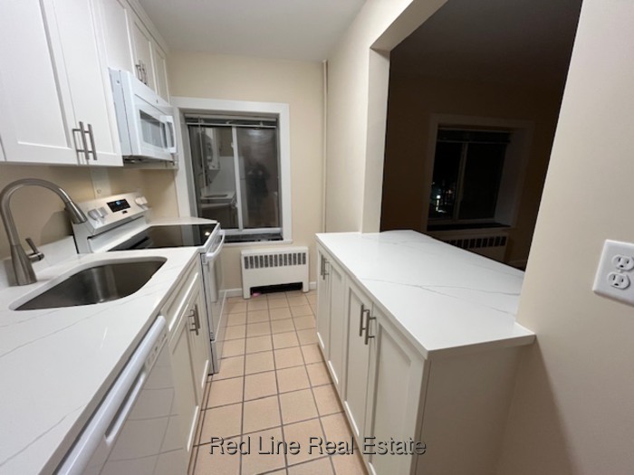 East - Large unit in a very well-maintained brick building with freshly painted and updated common hallways and 2 new elevators. Renovated galley kitchen with stone counters, upgraded "shaker-style" white cabinets, ceramic large-tile floor, dishwasher, disposer, and microwave. Breakfast bar from kitchen open to living room. 6 closets. Refinished hardwood floors. Updated bathroom with modern oversized shower with glass door. Freshly painted walls. Superintendent in building. Card-operated laundry. Storage bin. Off-street parking for 1 car. On bus lines. No pets and no smoking. Heat and hot water included in rent. (Some pictures shown may not be the actual unit but they accurately represent the style, condition, and quality.) 12-24 month lease terms allowed. NO PETS - 1 parking Lot Listing#-231670543