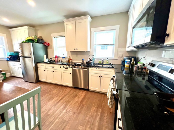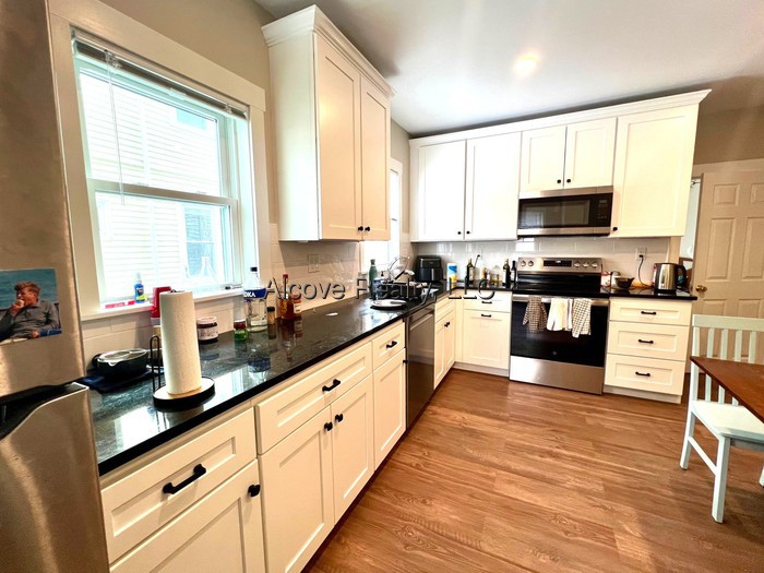 Tufts/Teele Square; Sunny and spacious living room, Eat-in kitchen include stainless steel appliances with dishwasher, disposal, and granite counters. Larger equal sized bedrooms, hardwood floors throughout, modern bath, finished basement area with laundry and private storage. Parking for one included, Short walk to Greenline MBTA and Tufts. Basement Coin Laundry